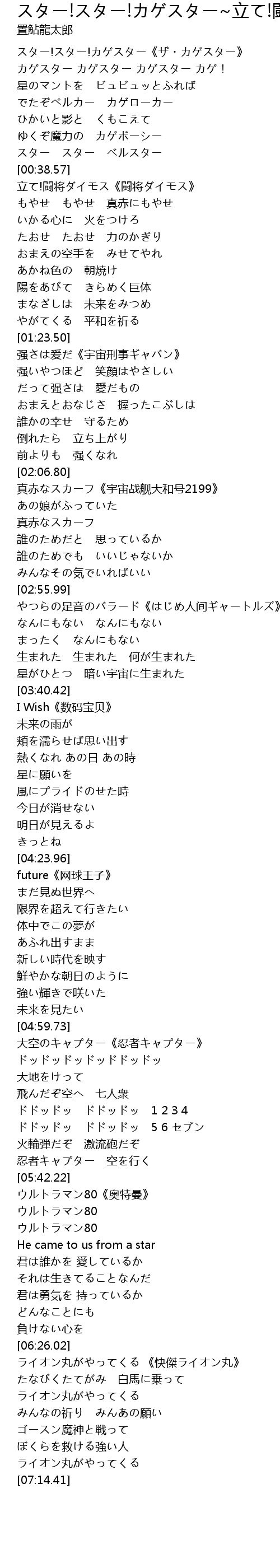 スター スター カゲスター 立て 闘将ダイモス 强さは爱だ 真赤なスカーフ やつらの足音のバラード I Wish Future 大空のキャプター ウルトラマン80 ライオン丸がやってくる Li Dou Jiang Qiang Ai Zhen Chi Zu Yin I Wish Future Da Kong 80 Wan Lyrics Follow Lyrics